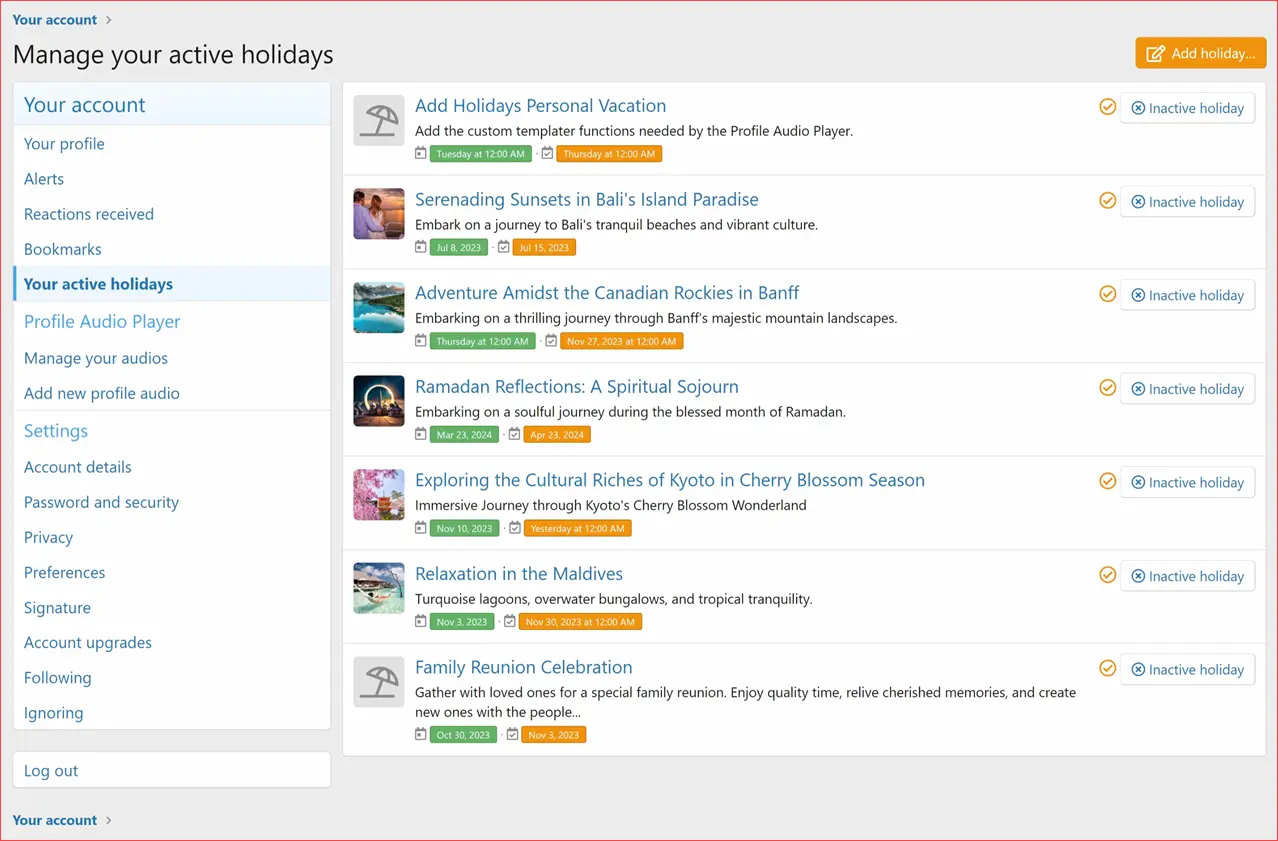 Легко создавайте и организуйте праздники, отпуска, мероприятия, поездки и контент, связанный с путешествиями, используя мощные инструменты редактирования. Легко управляйте отпусками пользователей. Разрешайте участникам делиться своими планами на отпуск и датами возвращения с помощью встроенных обсуждений. Загружайте праздничные фотографии с настраиваемыми параметрами отображения, ищите пользователей в отпуске, продвигайте группы пользователей и управляйте уведомлениями во время их отсутствия.