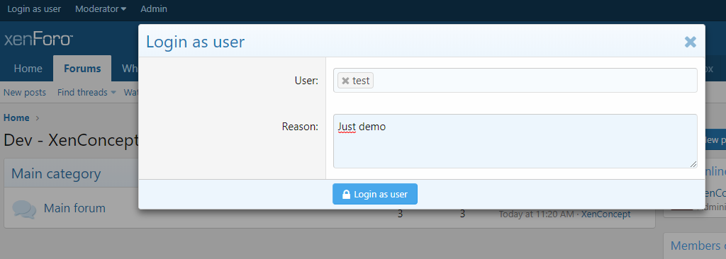 Login As User - с ним вы можете заходить в аккаунт любого пользователя на форуме. При входе в аккаунт "жертвы", приходит уведомление с причиной входа. Вы можете настраивать какие группы могут посещать другие аккаунты, вкл./откл. ответы в личных сообщениях и прочее.