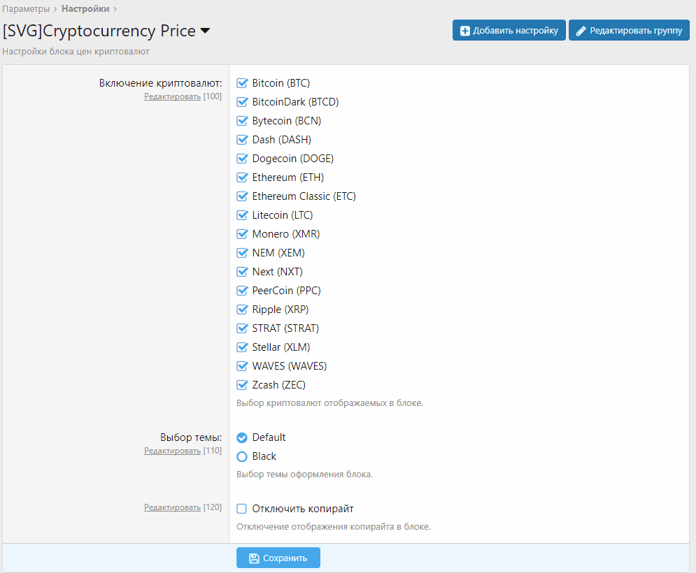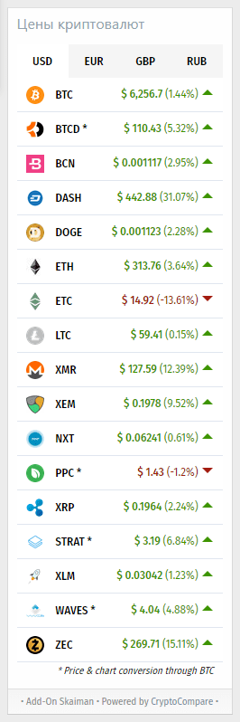 Совместимость с XenForo 2.1.x2.2.x 17 популярных криптовалют, с возможностью отключения в настройках. 2 темы оформления, выбор в настройках 4 валюты для отображения цен, не настраивается. 1741245142849.png 41.6 КБ · Просмотры: 63 1741245158881.png 53.1 КБ · Просмотры: 60