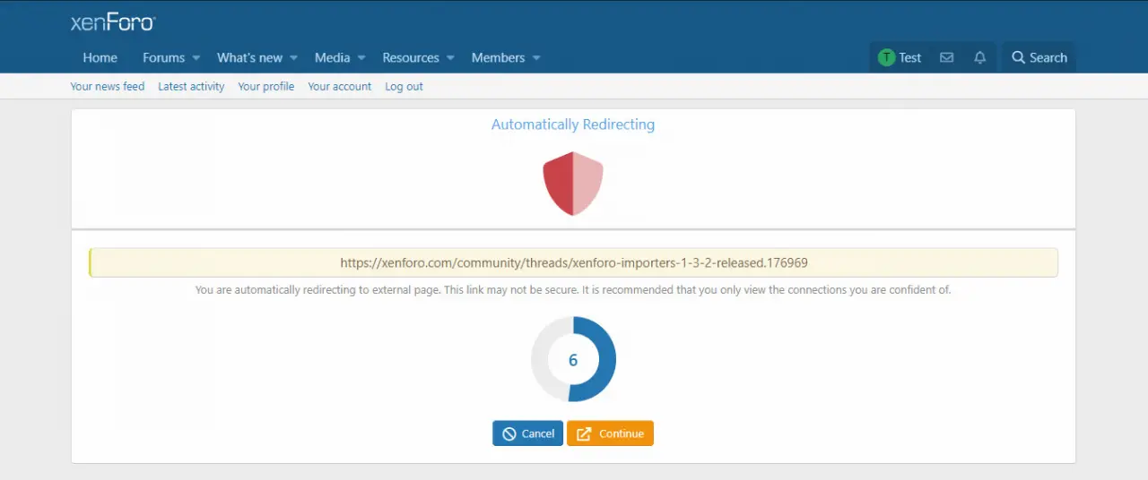 Дополнение позволяет показывать предупреждение с таймером обратного отсчета перед перенаправлением на внешние ссылки.
