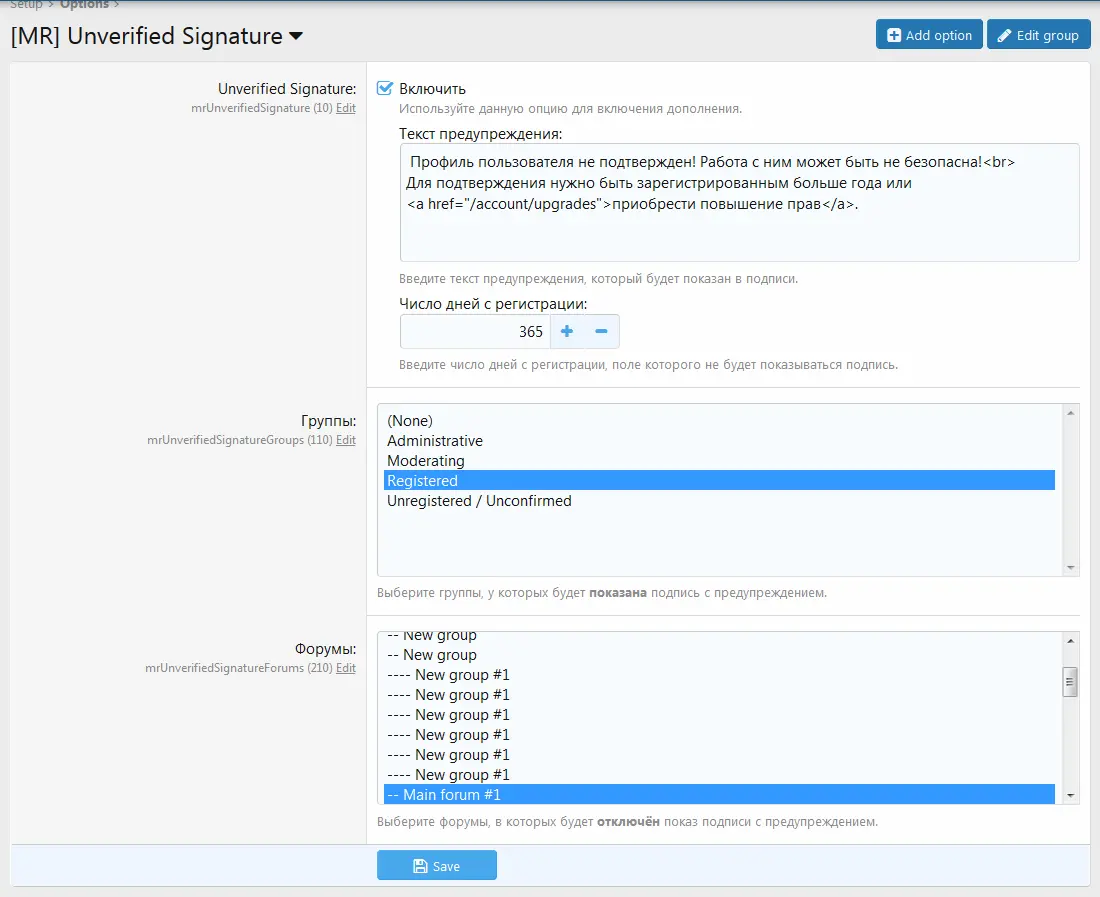 Совместимость с XenForo 2.1.x2.2.x2.3.x Дополнение позволит установить подпись с текстом предупреждения для определённой группы. 1.webp.webp 15.4 КБ · Просмотры: 45 2.webp.webp 43.1 КБ · Просмотры: 44