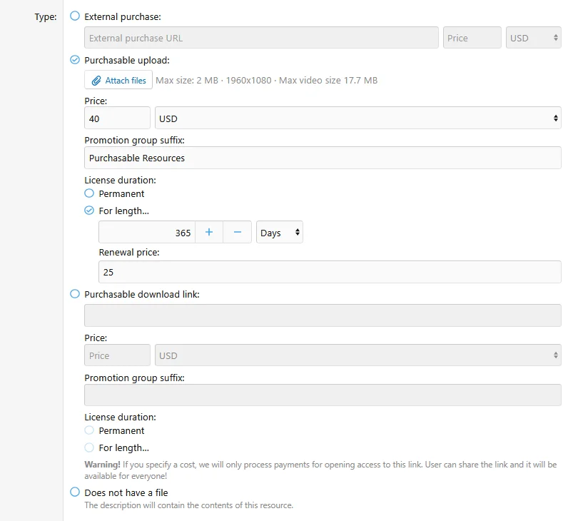 Добавляет новые типы ресурсов - платные загрузки файлов и платные внешние URL загрузки. Интегрируется с платежными провайдерами XenForo.