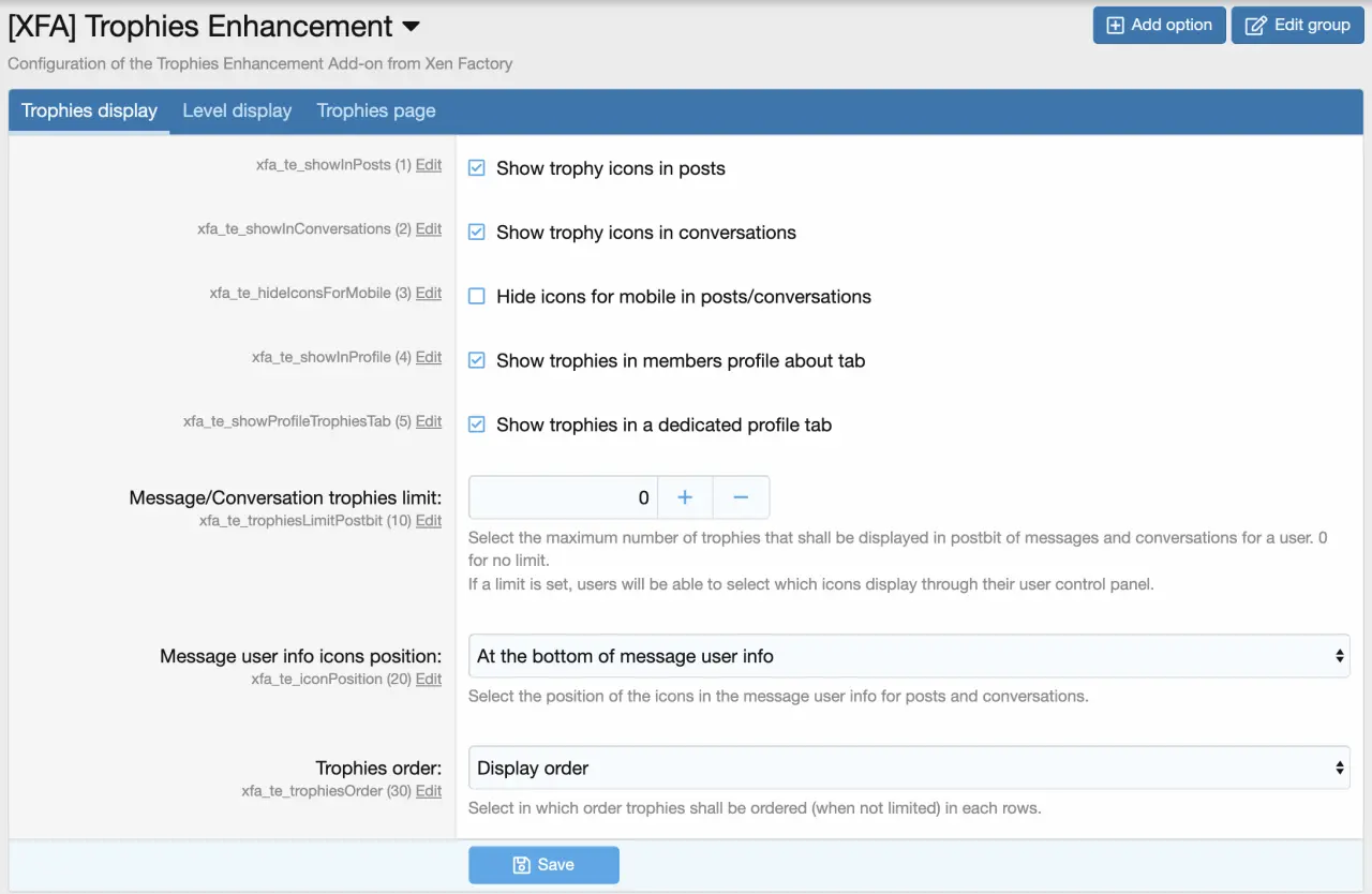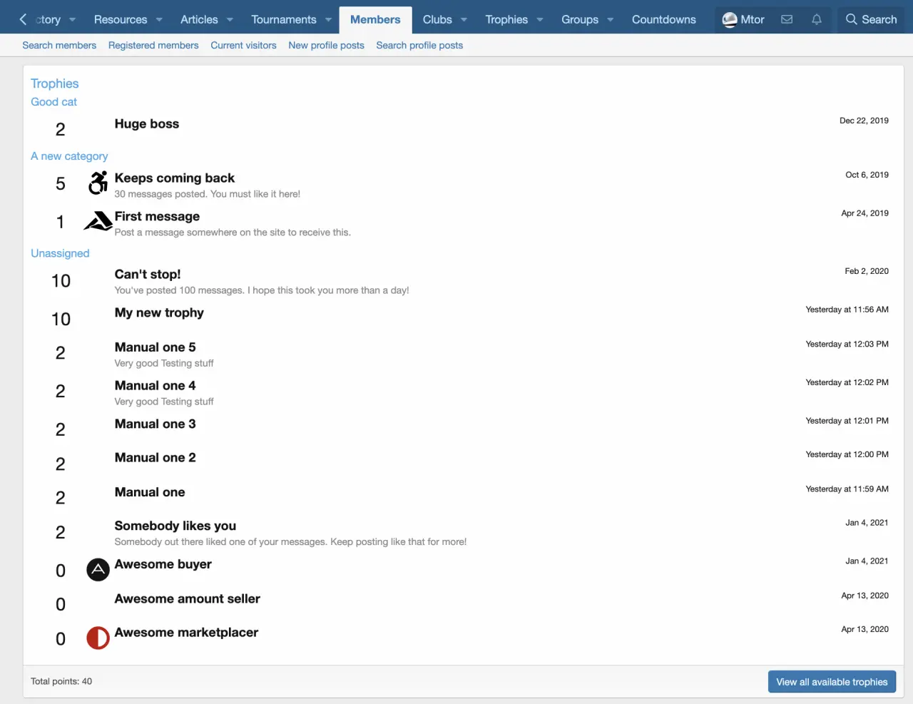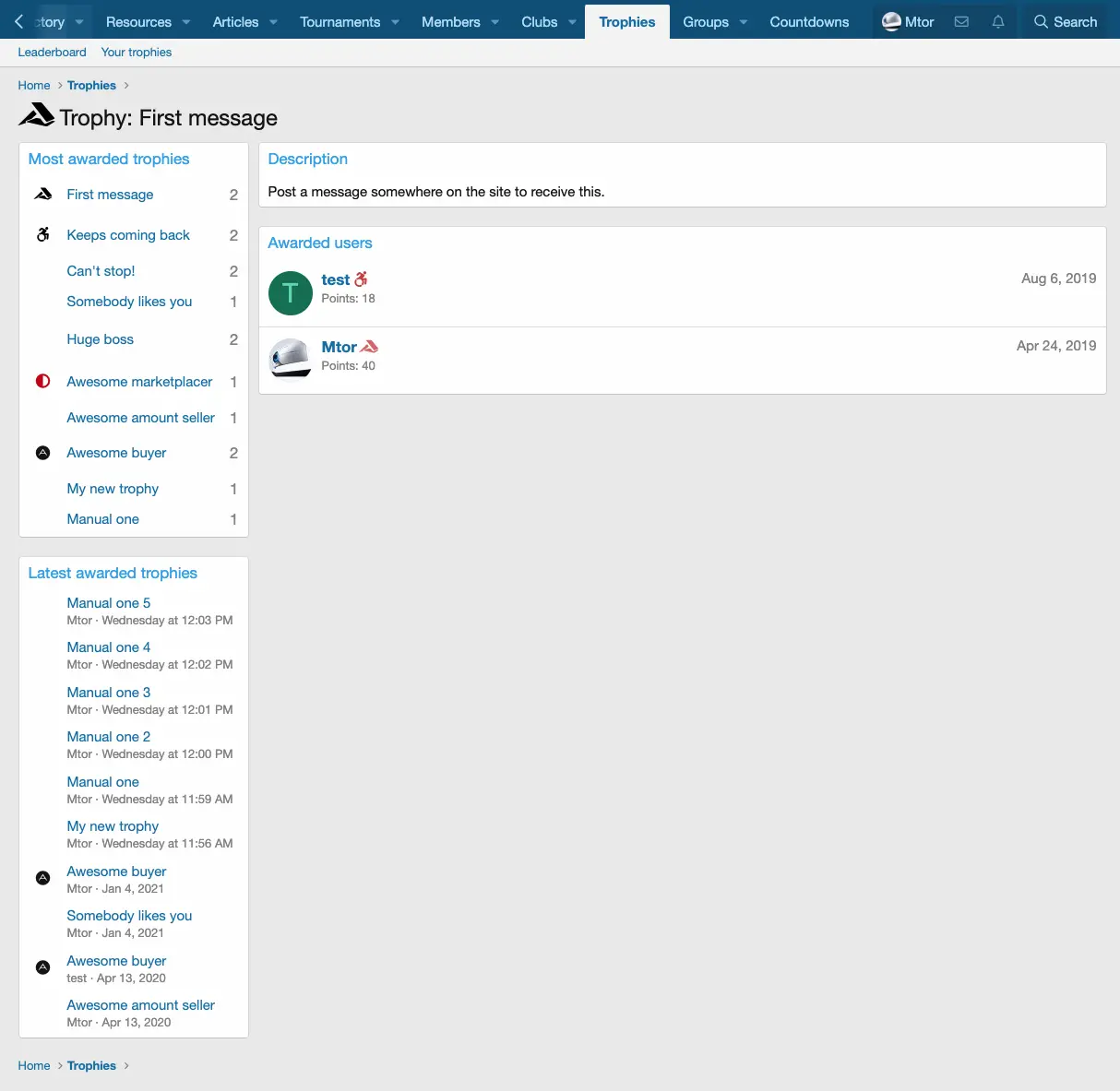 - Выбор администратором отображаемых трофеев в сообщениях сообщений и разговоров на вкладке трофеи страницы редактирования пользователя, если они ограничены [НОВЫЙ 2.2.0]