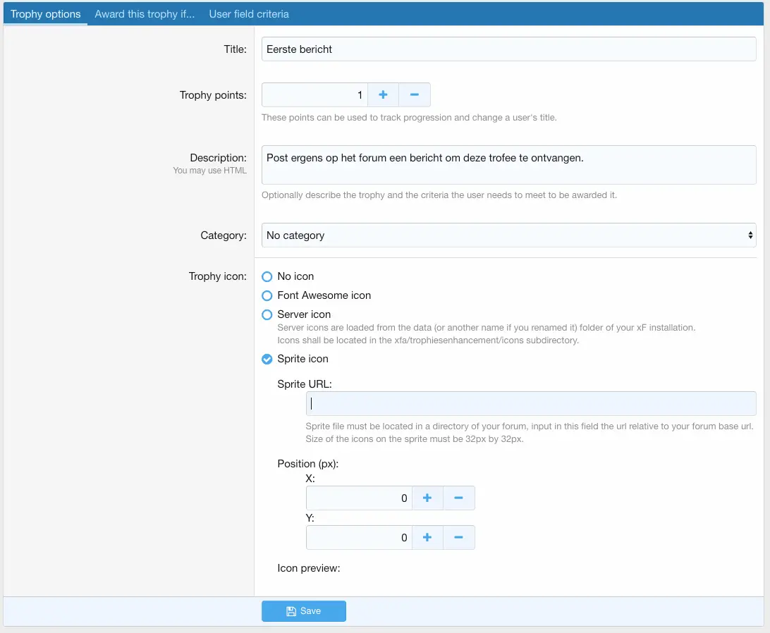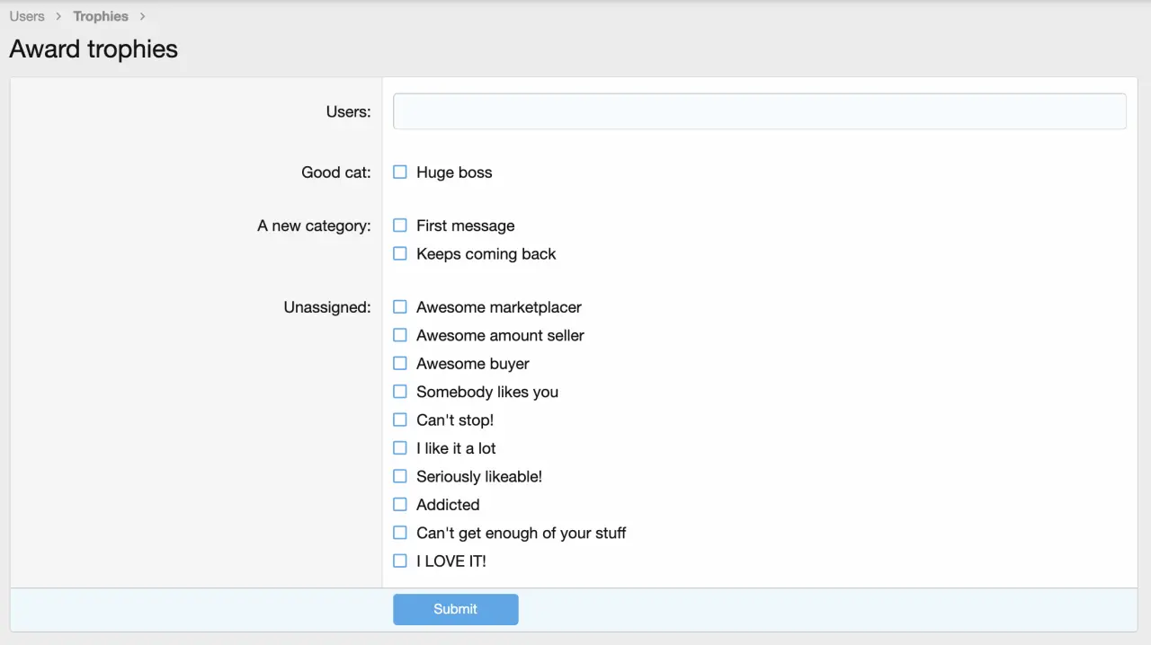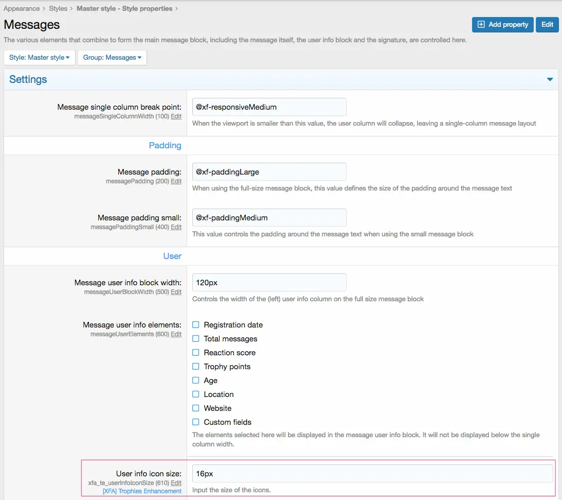 - Выбор администратором отображаемых трофеев в сообщениях сообщений и разговоров на вкладке трофеи страницы редактирования пользователя, если они ограничены [НОВЫЙ 2.2.0]