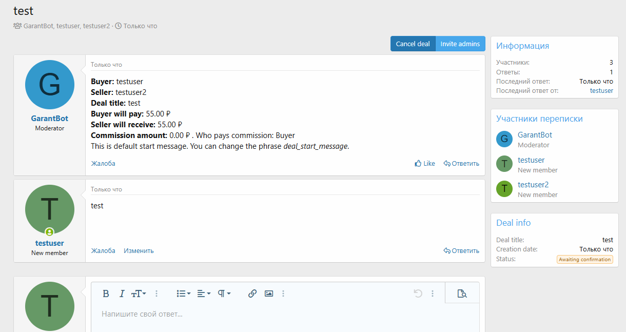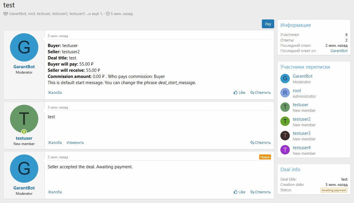 Функционал плагина добавляет авто-гарант через переписки на форуме, с возможностью вывод денег на криптокошелек после оплаты, настройки аккаунта гаранта, администратора, подробная статистика сделок и текущий список сделок.