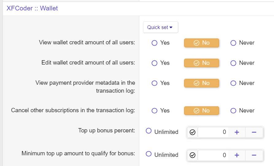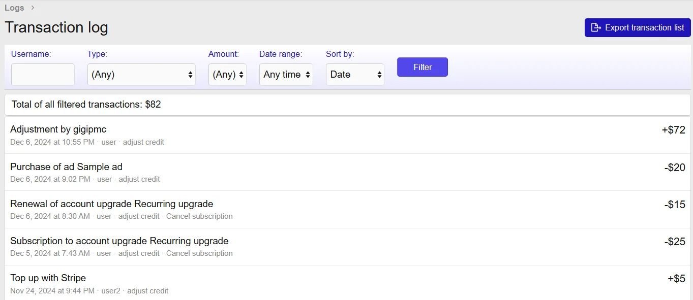 Поддерживает корректировки кредита (предназначено для администраторов и основано на разрешении). Корректировки регистрируются в журнале модератора. Также доступны пакетные корректировки кредита (например, «С Новым годом, бонус в размере 5 долларов для всех VIP-пользователей»).