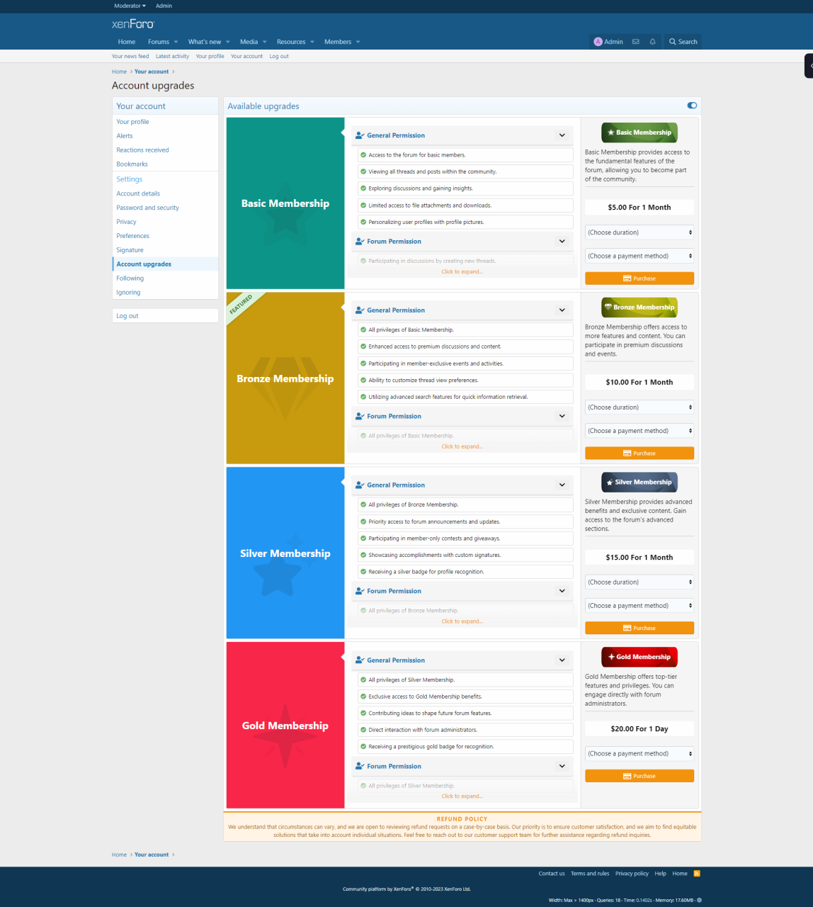страница обновления учетной записи XenForo предлагает администраторам сообщества множество вариантов настройки. Теперь вы можете представить пакеты обновления своей учетной записи в более привлекательной и удобной форме.