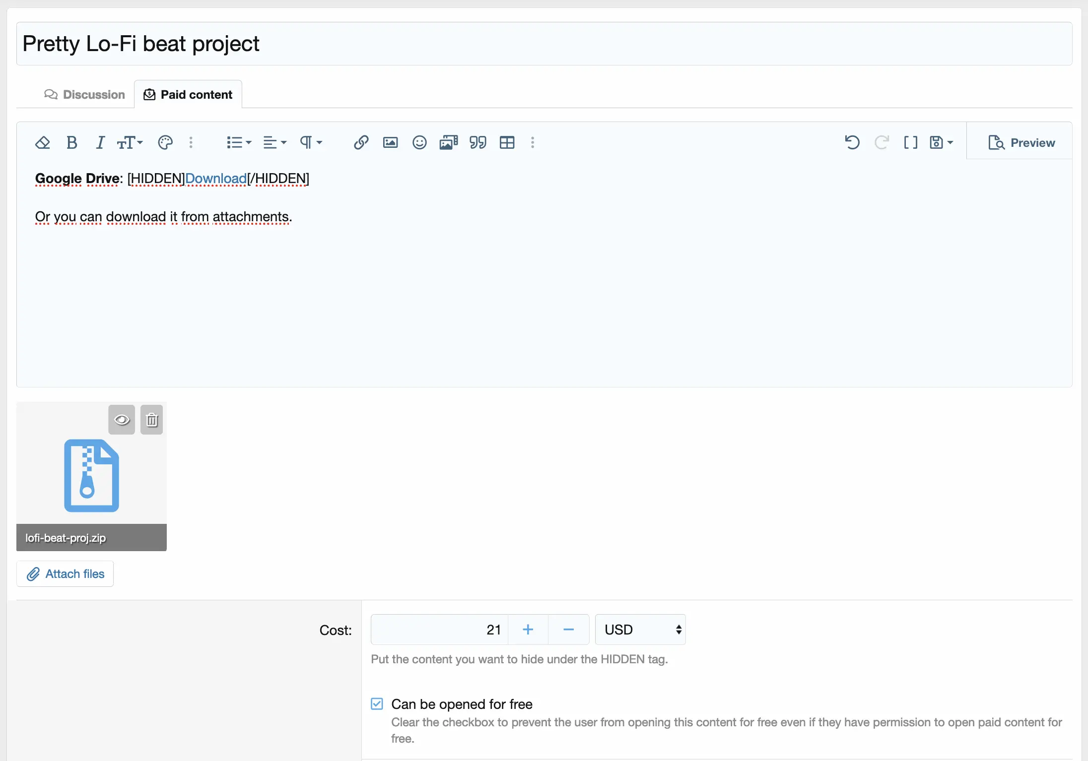 Это работает очень просто: вам нужно поместить контент, который вы хотите скрыть (ссылку на скачивание, важную информацию, прогноз на матч и т.д.), Под HIDDEN тегом, установить цену и получать оплату за каждый просмотр вашего контента. Таким образом, вы можете скрывать не только текст, но и вложения, для чего на каждом вложении есть кнопка (Примечание: предварительные просмотры изображений, которые были скрыты таким образом, все равно будут доступны).