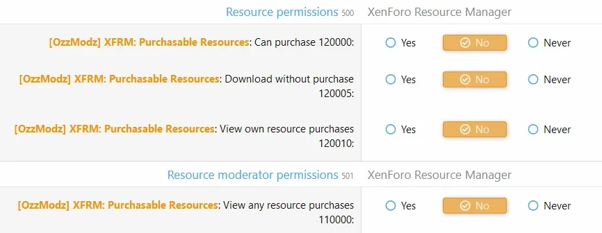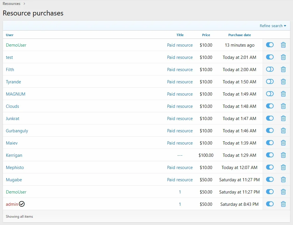- Покупки могут быть деактивированы (чтобы запретить дальнейшую загрузку ресурсов для приобретенного пользователя)