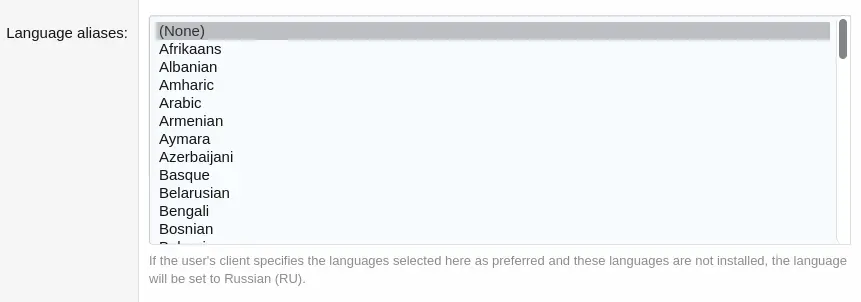 Например, для русского языка алиасами могут быть белорусский и украинский языки. Если пользователь использует белорусский, на сайте будет установлен русский язык, вместо языка по умолчанию