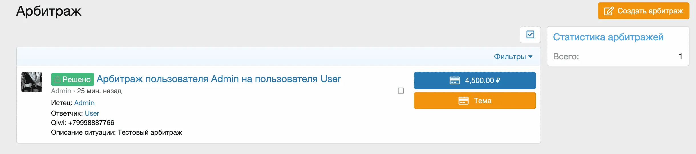 • Выбор пользователя отвечающего за арбитражи и черного списка