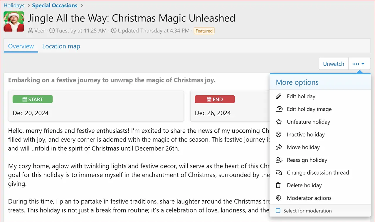 Легко создавайте и организуйте праздники, отпуска, мероприятия, поездки и контент, связанный с путешествиями, используя мощные инструменты редактирования. Легко управляйте отпусками пользователей. Разрешайте участникам делиться своими планами на отпуск и датами возвращения с помощью встроенных обсуждений. Загружайте праздничные фотографии с настраиваемыми параметрами отображения, ищите пользователей в отпуске, продвигайте группы пользователей и управляйте уведомлениями во время их отсутствия.