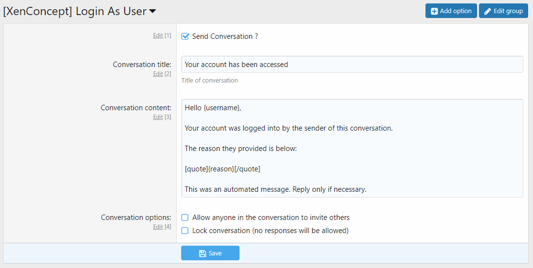 Login As User - с ним вы можете заходить в аккаунт любого пользователя на форуме. При входе в аккаунт "жертвы", приходит уведомление с причиной входа. Вы можете настраивать какие группы могут посещать другие аккаунты, вкл./откл. ответы в личных сообщениях и прочее.