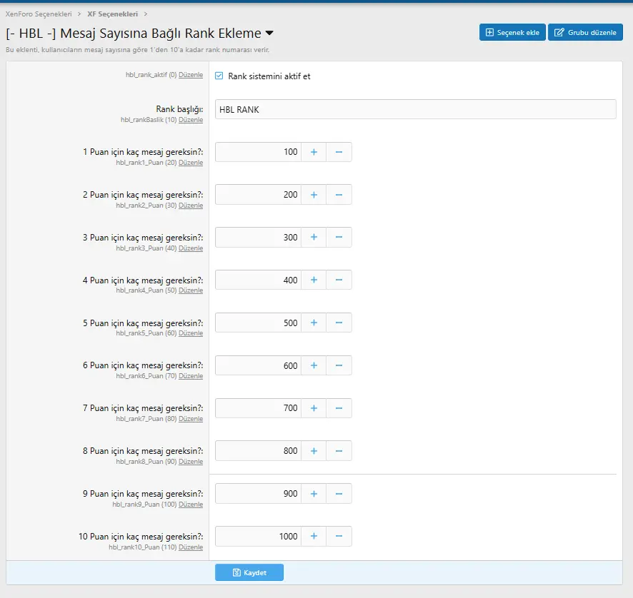 Плагин добавляет ранг в зависимости от количества сообщений пользователей и присваивает число от 0 до 10. Вы можете указать количество сообщений для номеров и активировать или деактивировать плагин из админки. Вы можете установить параметры плагина в области настроек XenForo в панели администратора.