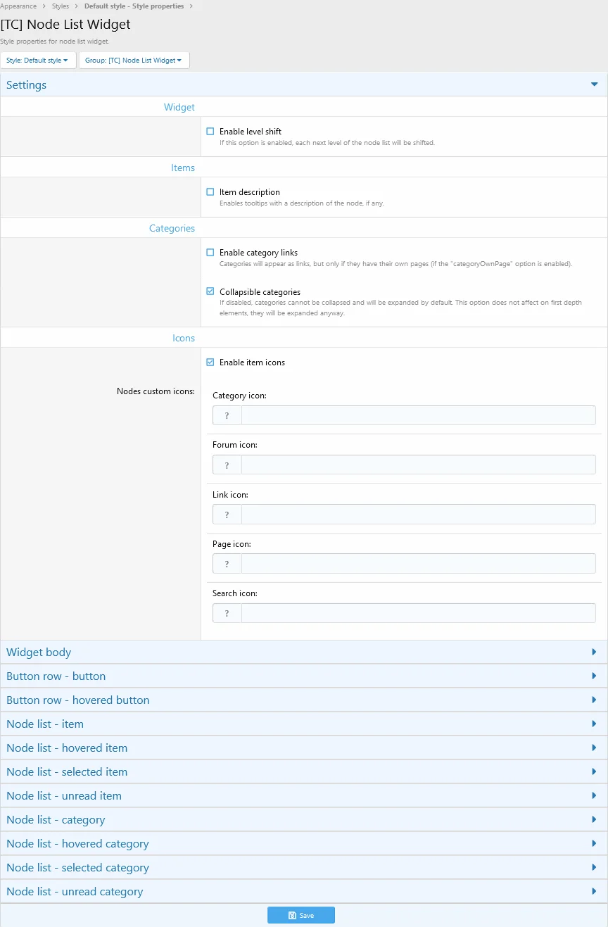 - Настройки стиля, такие как включение заголовка виджета (обычно выключено), отступы между уровнями (каскады), отображение описания узлов (если есть) и отображение категорий в виде ссылок (если категории имеют свои собственные страницы)