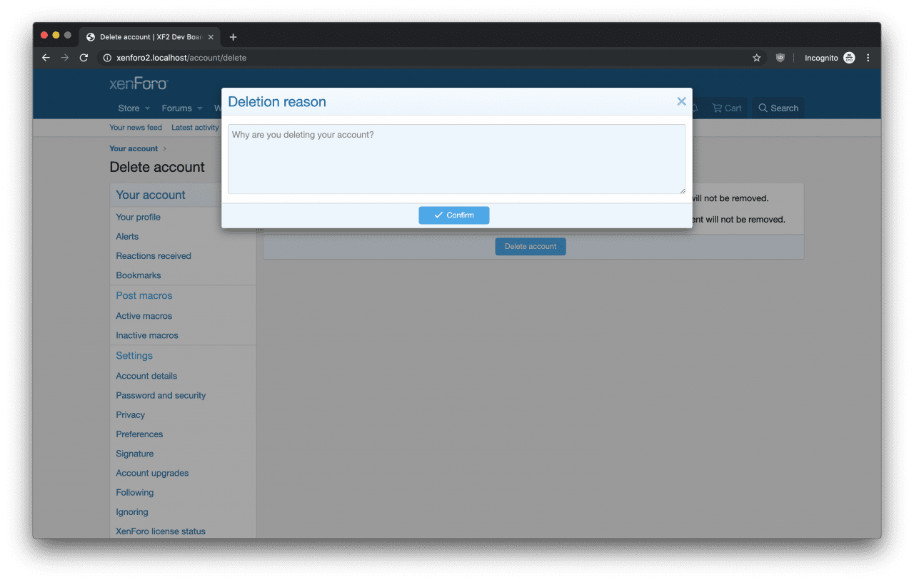 Плагин позволит Вашим пользователям самим удалять свои учётные записи с форума. У администратора имеется возможность установить период, в течении которого пользователь может передумать и отменить удаление своего аккаунта.