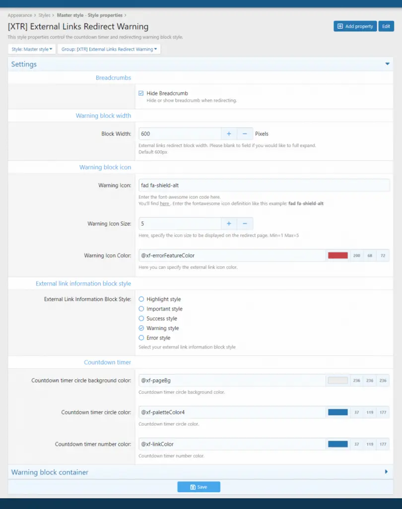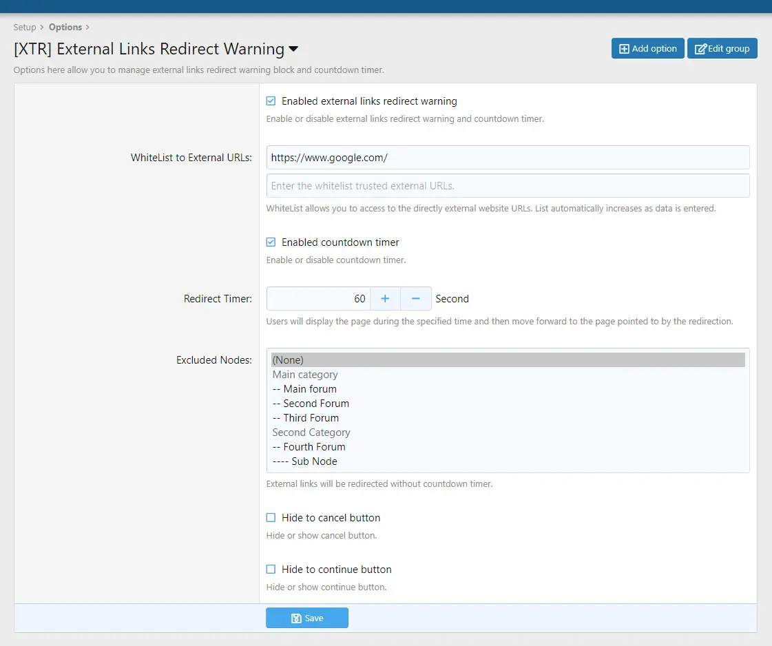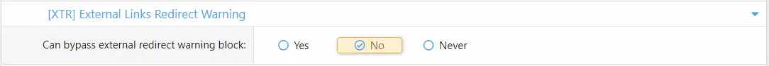 Дополнение позволяет показывать предупреждение с таймером обратного отсчета перед перенаправлением на внешние ссылки.