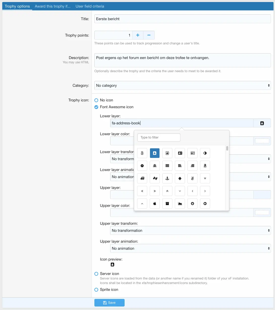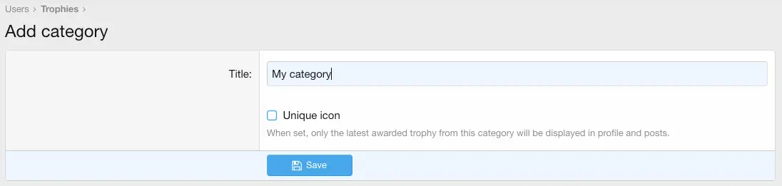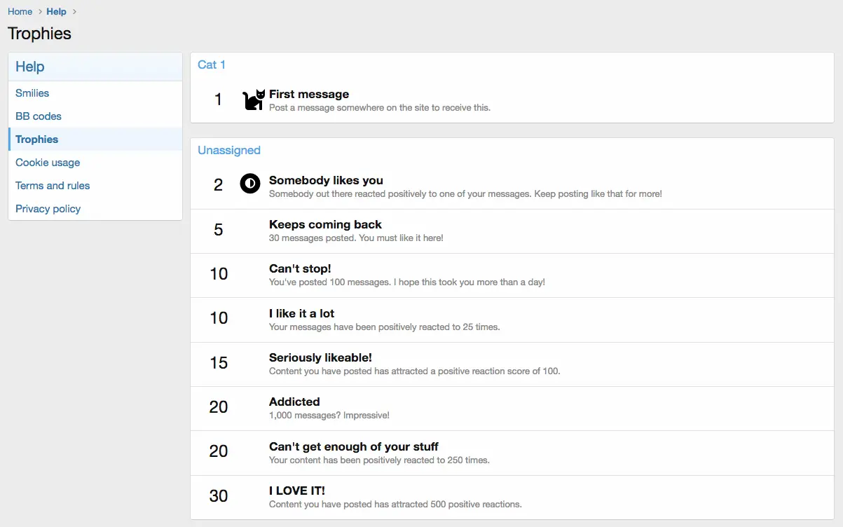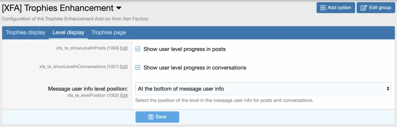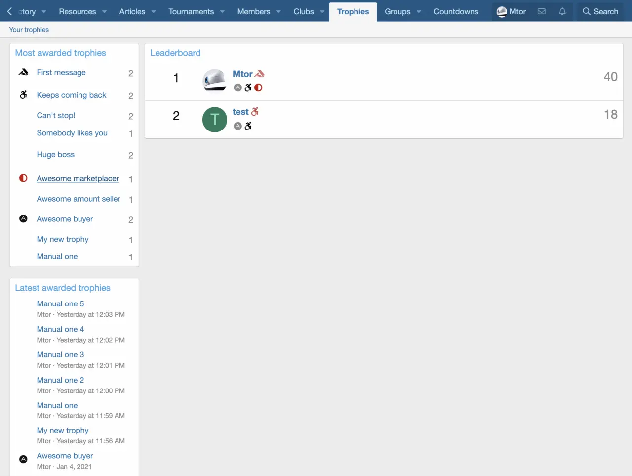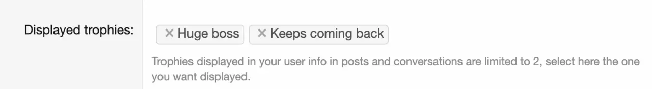 - Выбор администратором отображаемых трофеев в сообщениях сообщений и разговоров на вкладке трофеи страницы редактирования пользователя, если они ограничены [НОВЫЙ 2.2.0]