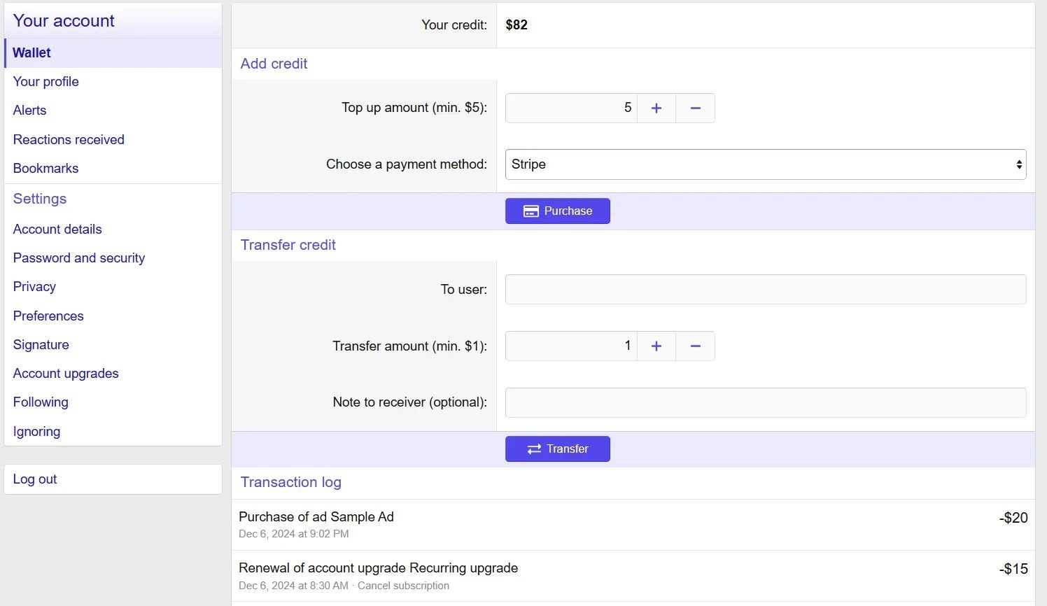 Поддерживает корректировки кредита (предназначено для администраторов и основано на разрешении). Корректировки регистрируются в журнале модератора. Также доступны пакетные корректировки кредита (например, «С Новым годом, бонус в размере 5 долларов для всех VIP-пользователей»).