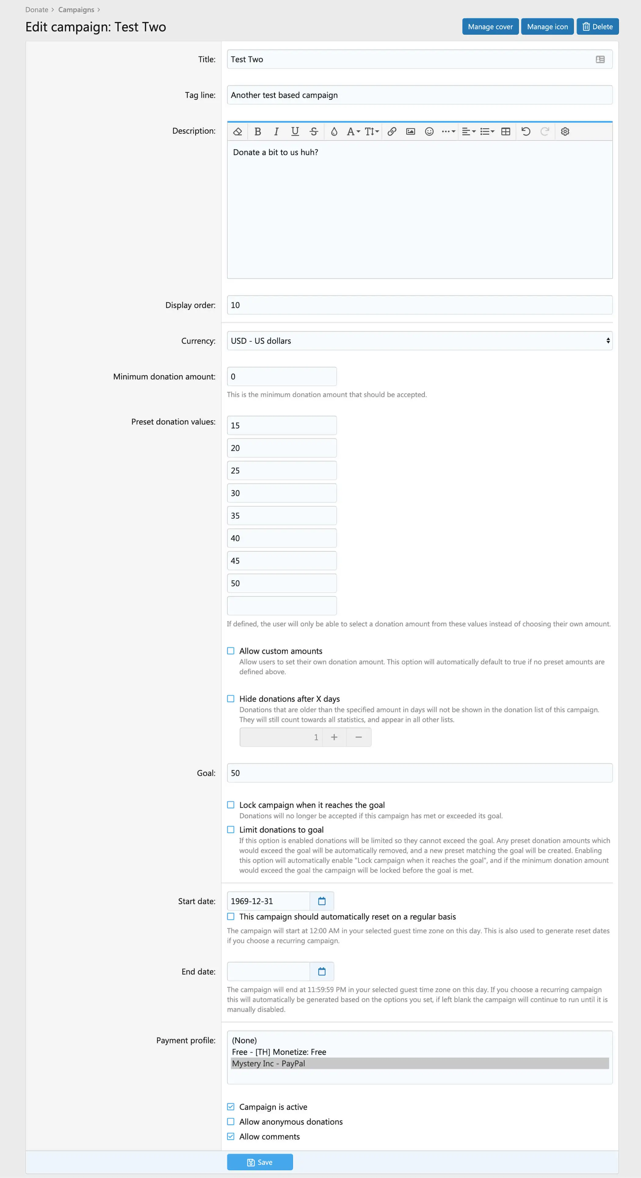 - Включить / отключить анонимные пожертвования для каждой кампании