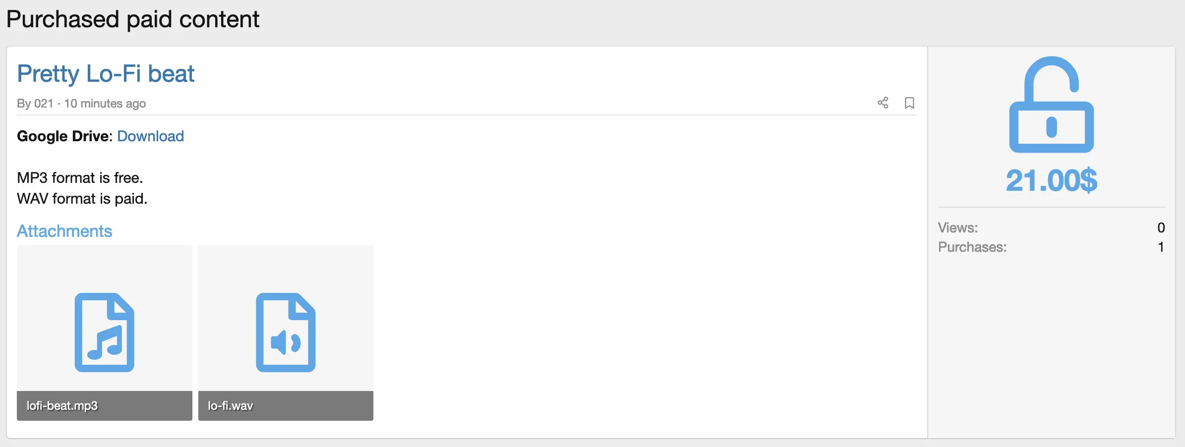 Это работает очень просто: вам нужно поместить контент, который вы хотите скрыть (ссылку на скачивание, важную информацию, прогноз на матч и т.д.), Под HIDDEN тегом, установить цену и получать оплату за каждый просмотр вашего контента. Таким образом, вы можете скрывать не только текст, но и вложения, для чего на каждом вложении есть кнопка (Примечание: предварительные просмотры изображений, которые были скрыты таким образом, все равно будут доступны).