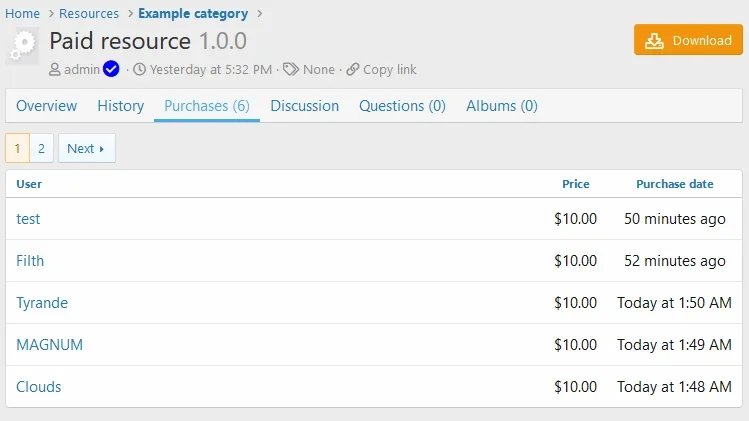 - Вкладка на странице ресурса со списком приобретенных пользователей