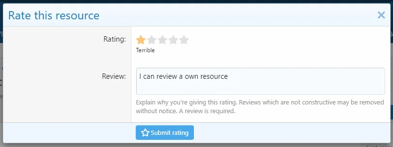 [MMO] Rate Own Resources - Плагин позволит Вам разрешить пользователям оценивать и оставлять отзывы к их собственным ресурсам.